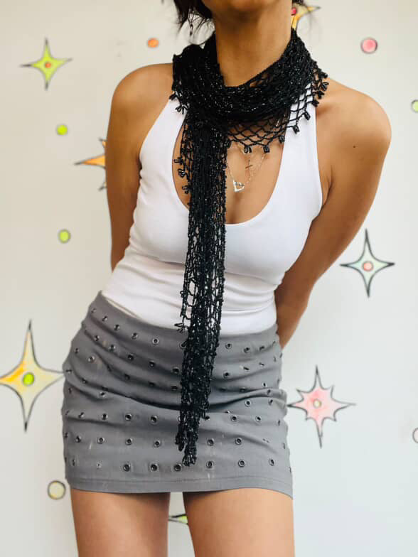 This dramatic fully black beaded fringe shawl is a statement piece for any whimsy goth, fairy grunge, or festival-inspired wardrobe. With intricate beadwork and flowing fringe, it adds instant magic and edge whether worn draped over the shoulders, layered with dresses, or styled as a performance piece.