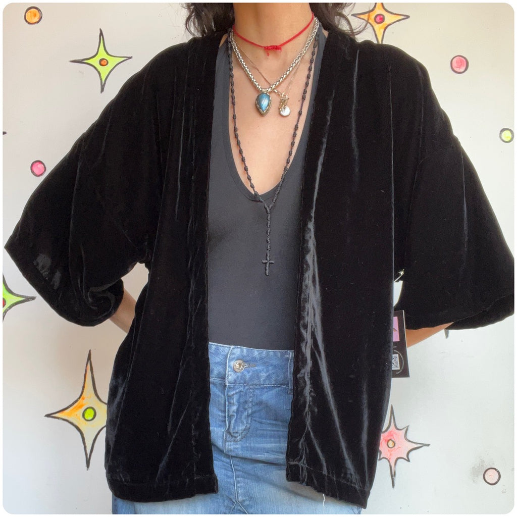 Vintage Black Velvet Kimono Jacket Top Duster Bolero Classic Timeless Goth Boho