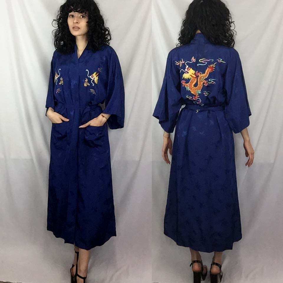 Vintage | Blue Kimono Dragon Robe Embroidered Boho Festival Chinese Geisha