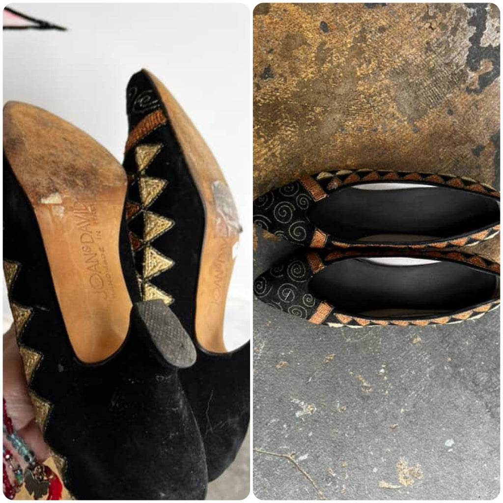 Elegant and timeless, these vintage Joan & David black velvet pumps feature beautifully embroidered earth tones across the toe for a refined, artistic touch. Crafted in Italy with a quality leather sole, they offer both comfort and sophistication with a manageable 1.5" heel - perfect for day-to-night wear.