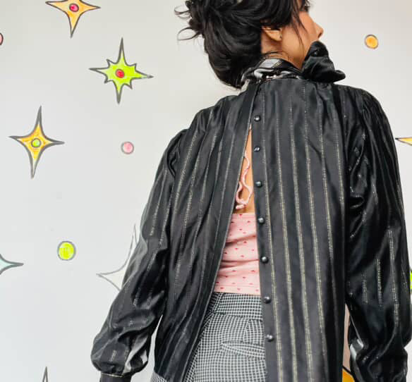Exude timeless sophistication in this silver and black secretary bow blouse from the NIGHT by Valentino collection. Featuring a chic metallic sheen, dramatic neck tie, and a flattering drape, this vintage designer piece is perfect for pairing with pencil skirts, wide-leg trousers, or tailored suits. Dress it up for evening events or add a touch of glam to your workwear rotation.
