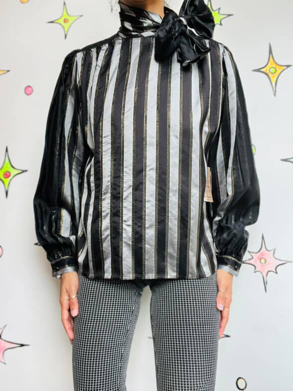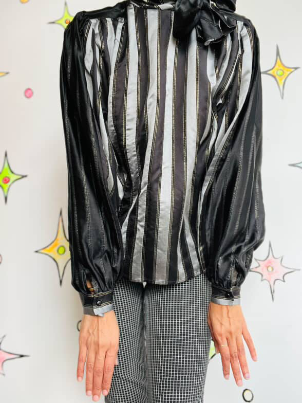 Silver & Black Secretary Bow Blouse - NIGHT by Valentino - M/L - Elegant Vintage Designer Top