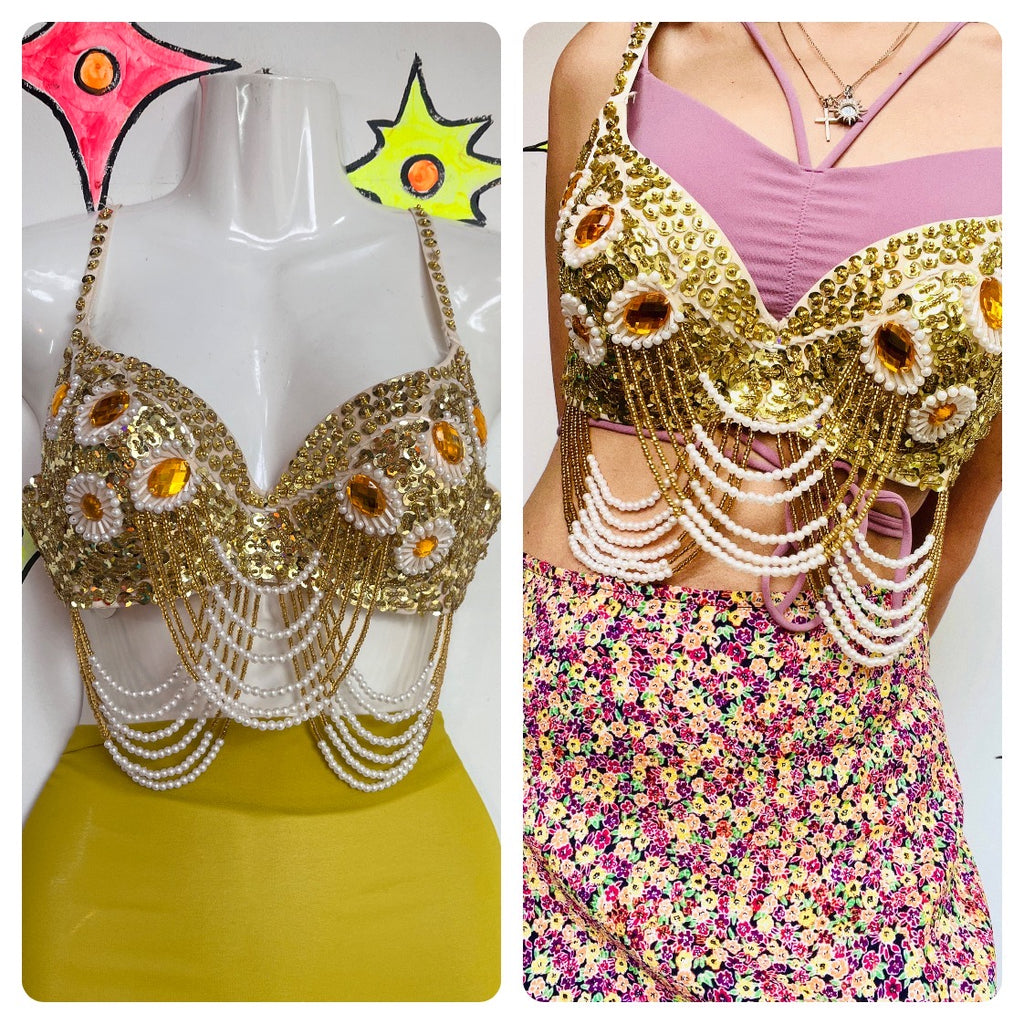 Vintage Gold Beaded Boho Hippie Gypsy Bellydancer Selena Seqin Bustier Bra Top