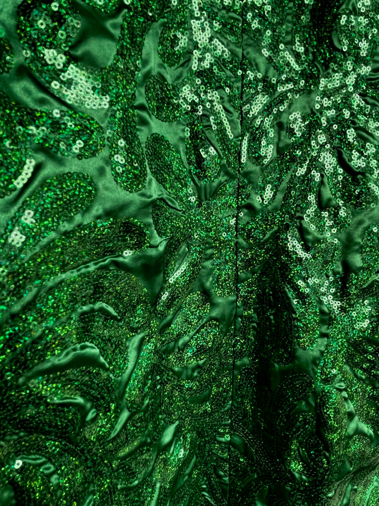 Statement vintage metallic green tuxedo smoking jacket / glam 80s-style blazer. Features bold sparkling sequin look and an oversized silhouette - perfect for drag, stagewear, party outfits, prom, photoshoots, or glam rock styling. Eye-catching piece that instantly elevates any look.