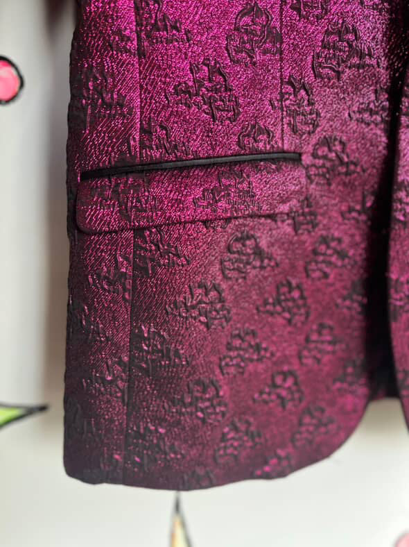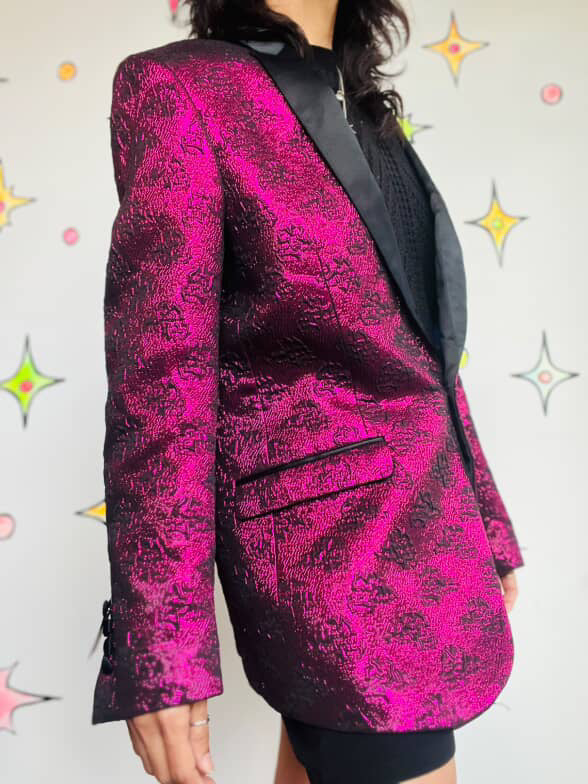 Turn heads in this bold vintage metallic pink tuxedo smoking jacket! Featuring structured shoulder pads, a sleek tailored fit, and glam-rock shimmer, this Retro Paris blazer is pure statement style. Perfect for stage wear, parties, drag, or standout formal looks. Faux pockets maintain the sleek silhouette. A rare glam vintage find that captures the confidence of the 80s and early 90s.