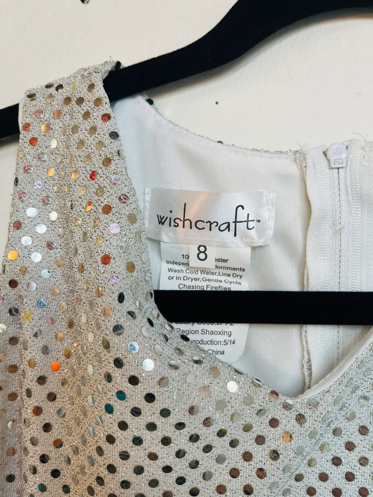Though tagged as kids size 8, this piece comfortably fits a modern women's XS-S thanks to its stretch and proportions. A versatile glam costume dress with serious sparkle and vintage party appeal.