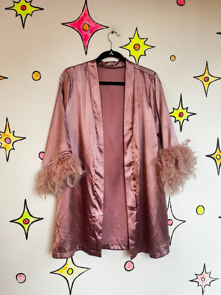 Vintage Pink Satin Feather Trim Boudoir Robe – Old Hollywood Glam Lingerie – M
