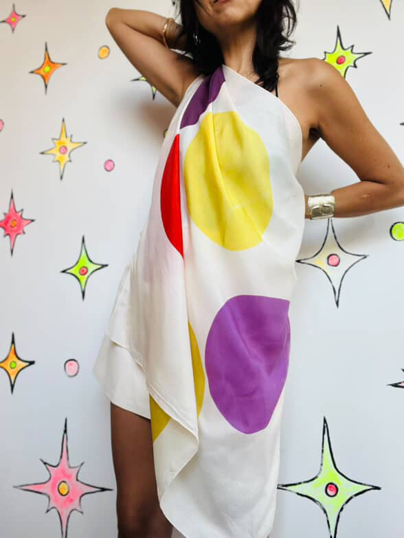 Brighten your wardrobe with this vintage wearable art silk scarf featuring large rainbow polka dots on an off-white base. Dating from the 1940s, this unique piece carries whimsical magician-inspired charm and a soft, luxurious silk feel. Perfect for draping, tying, or adding a pop of color to any outfit.