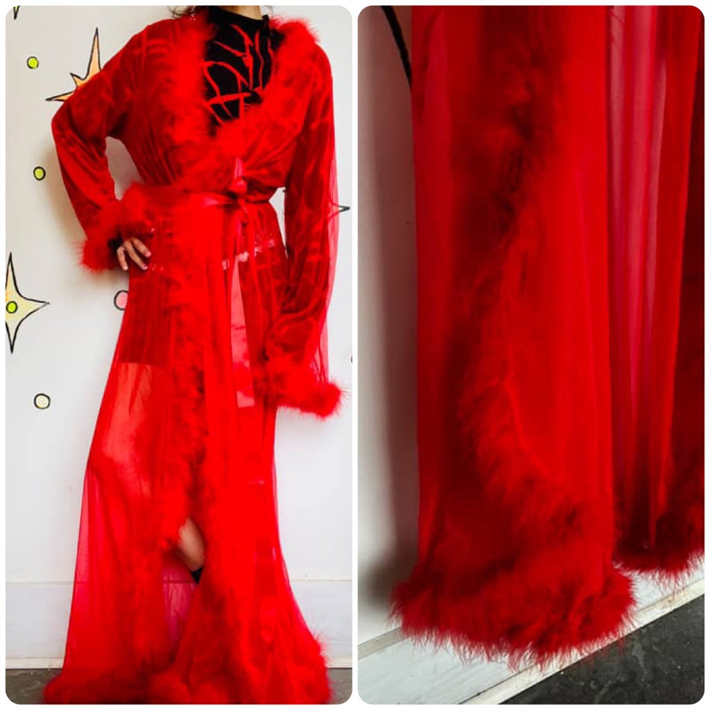 Vintage Red Sheer Feather Trim Old Hollywood Glam Vamp Robe Kimono