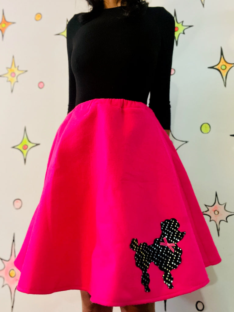 Iconic retro 1950s-style hot pink poodle skirt with classic black poodle applique and leash detail. Full circle swing shape - perfect for sock hops, costume parties, school plays, and rockabilly looks. Very good condition with no visible alterations, tears, or stains. Elastic waist offers a flexible fit.