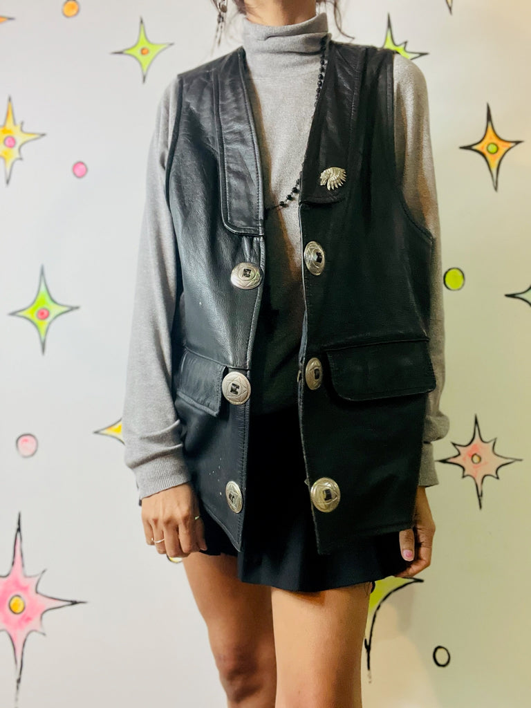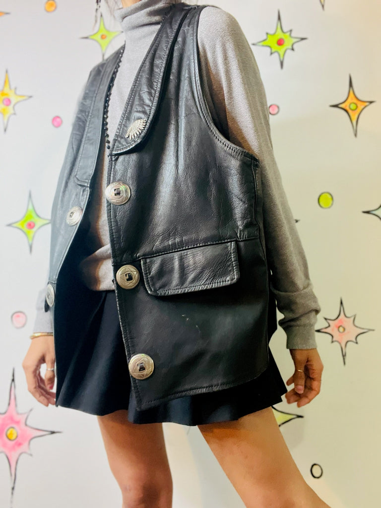 Rugged vintage black leather biker vest with Western and boho-grunge vibes, featuring silver conchos for classic statement detailing. Perfect layered over flannels, tees, or dresses for edgy styling.