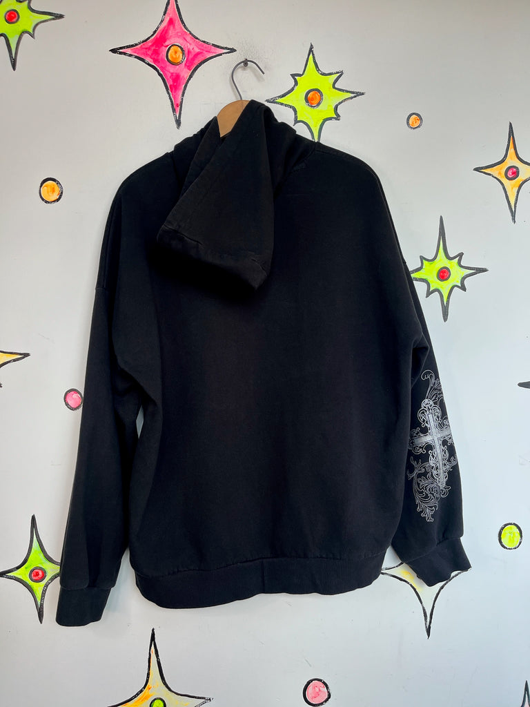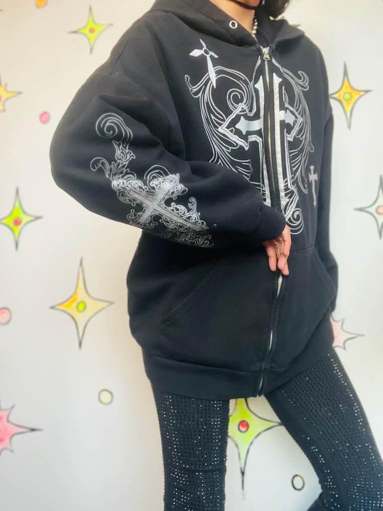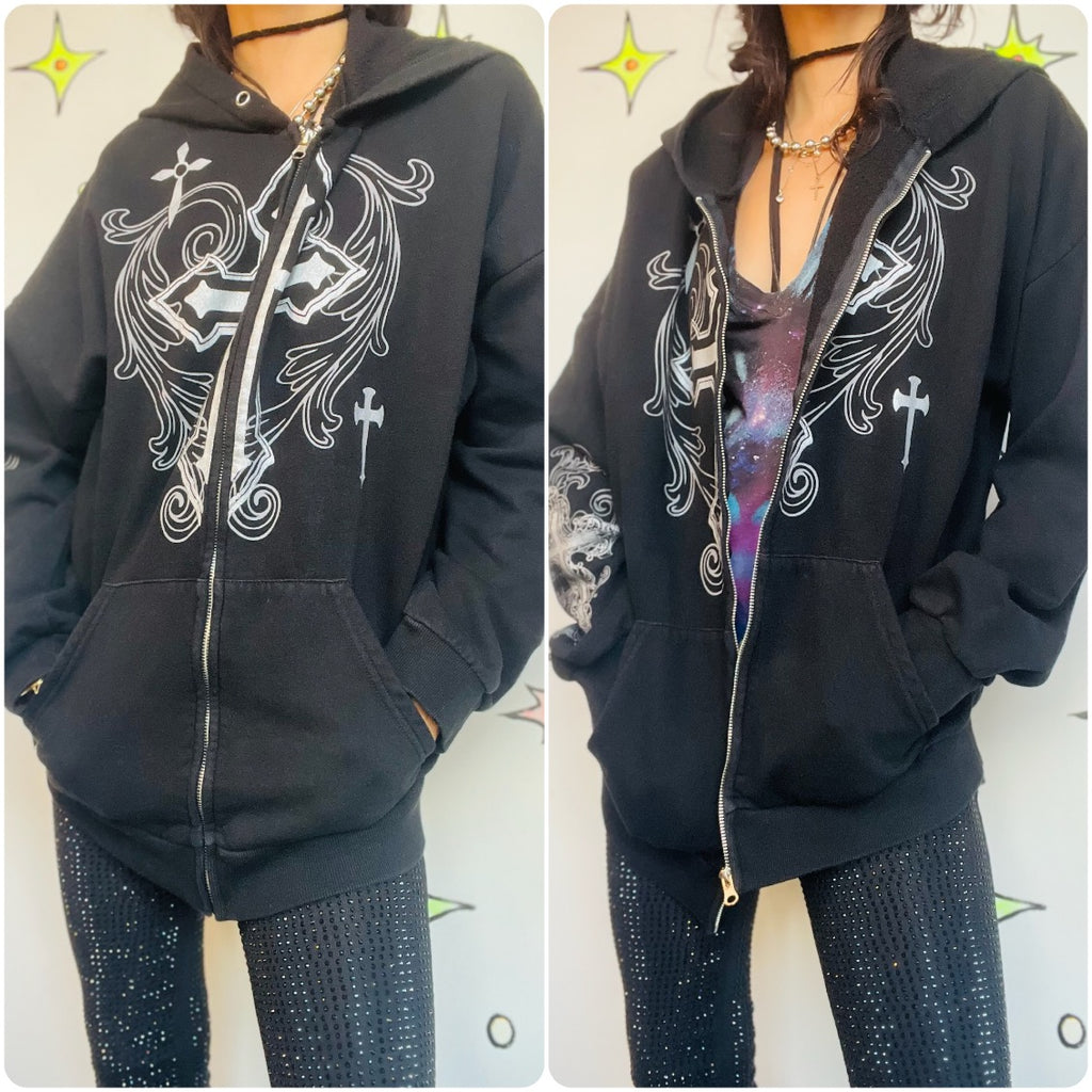 Epic Y2K goth-grunge zip-up hoodie featuring a bold cross graphic and tattoo-inspired fairy vibes-classic 2000s alternative fashion. Black, cozy, and perfectly oversized for that slouchy emo-skater look.
