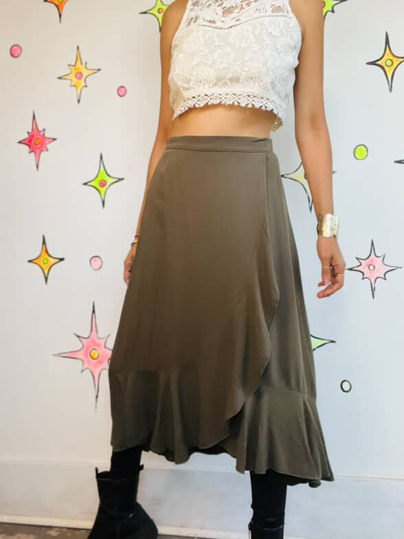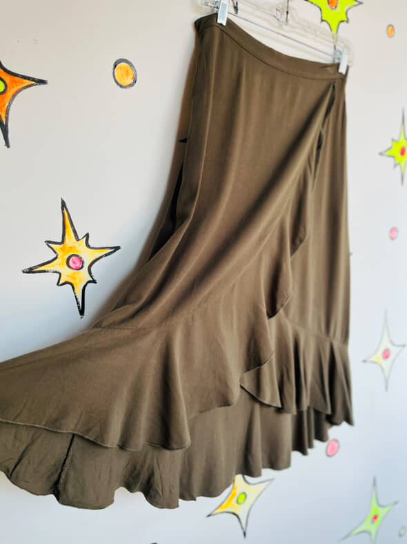 Embrace Y2K fairy grunge vibes with this vintage olive green ruffled skirt by Altrd State. Flowing and lightweight, it features a stretchy waistband, open/expandable hips, and layered ruffles for a whimsical, boho-inspired silhouette. Perfect for festivals, casual layering, or styling with crop tops and boots. In very good vintage condition with no stains or tears.