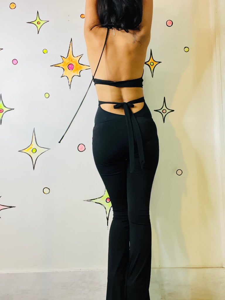 🖤 Y2K Black Cut-Out Slinky Disco Glam Flare Jumpsuit - Sexy Cat Suit - XS 🖤