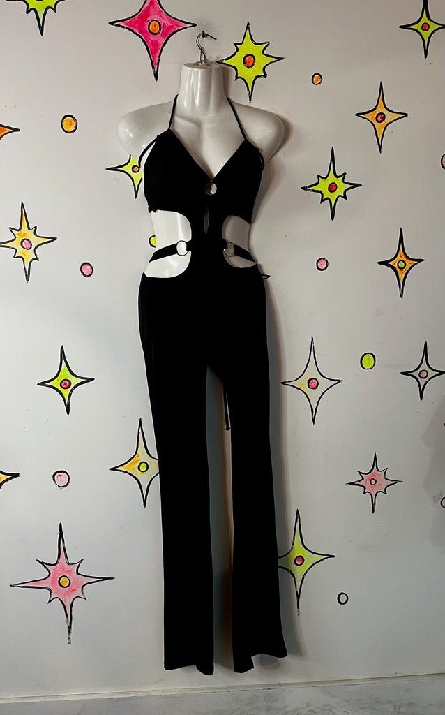 Ultra-sleek Y2K slinky black jumpsuit featuring bold cut-outs, a curve-hugging fit, and dramatic flare legs for that true disco-party, club-kid, glam-grunge energy. Stretchy, comfortable, and seriously eye-catching. Very good vintage condition with no visible alterations, stains, or tears.