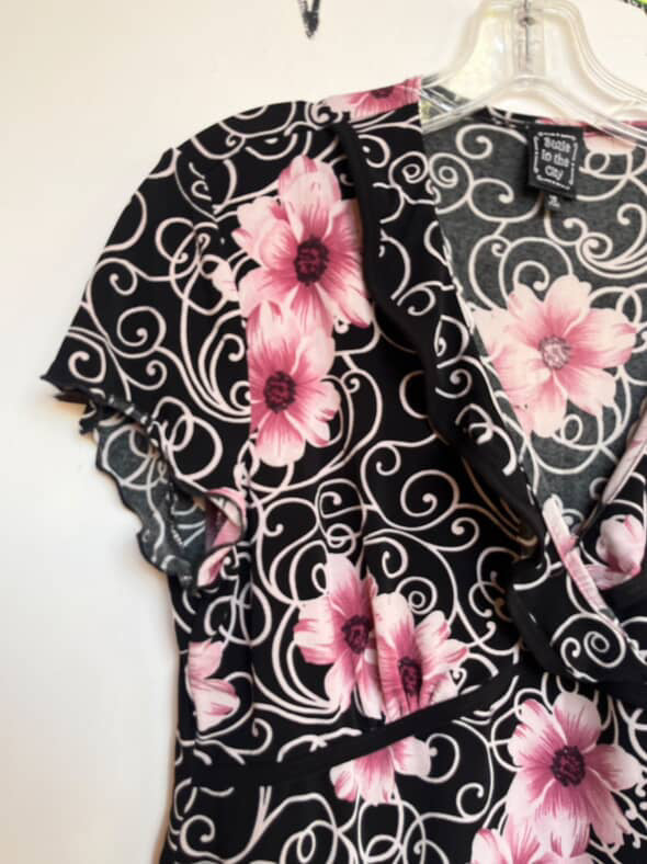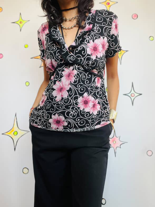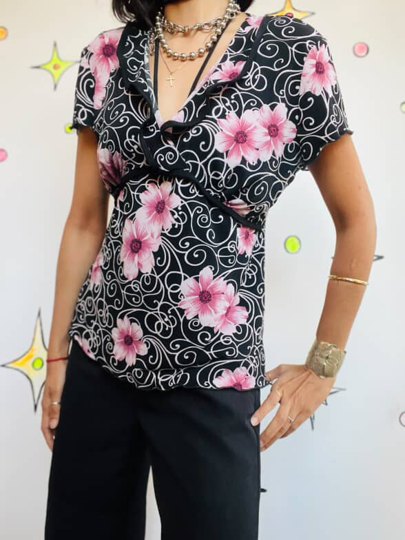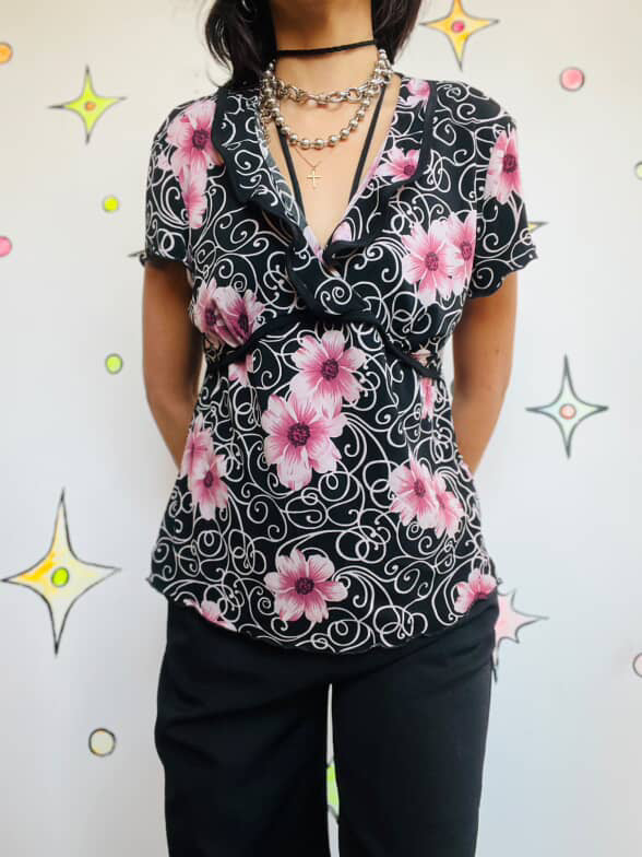 🖤 Embrace your inner fairy goth dream in this Y2K black stretchy top with pink floral print by Suzie in the City. Perfect for coquette, whimsy, and grunge-inspired looks - this soft, curve-hugging blouse pairs effortlessly with mini skirts, cargos, or your favorite vintage jeans.