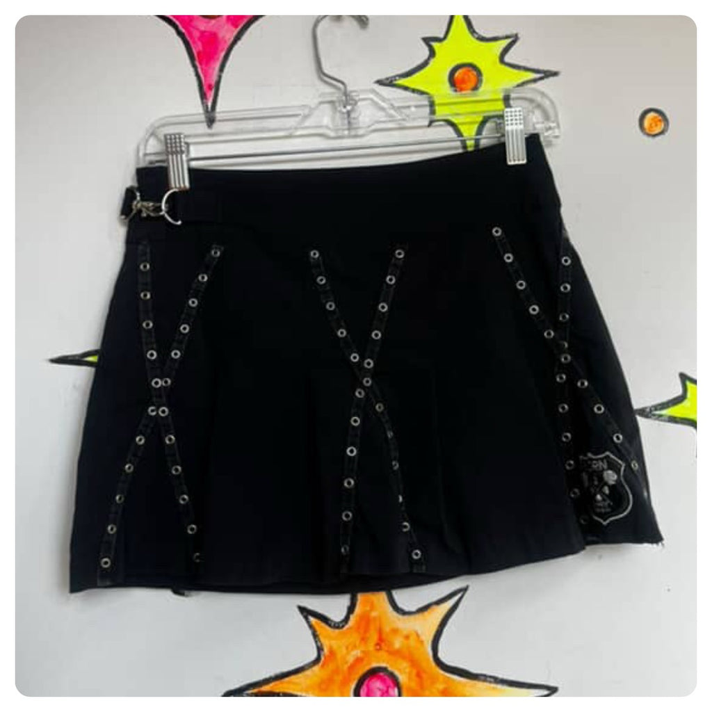 Elevate your alternative look with this ultra-chic Y2K mini skort by Limited Too. Designed with a bold combination of punk and goth influences, this pleated skort features studded detailing and a bondage edge that makes it a standout statement piece. Crafted from a comfortable blend of 74% rayon, 22% nylon, and 4% spandex, its flattering fit and movement-friendly fabric ensure you can rock this mini with confidence.