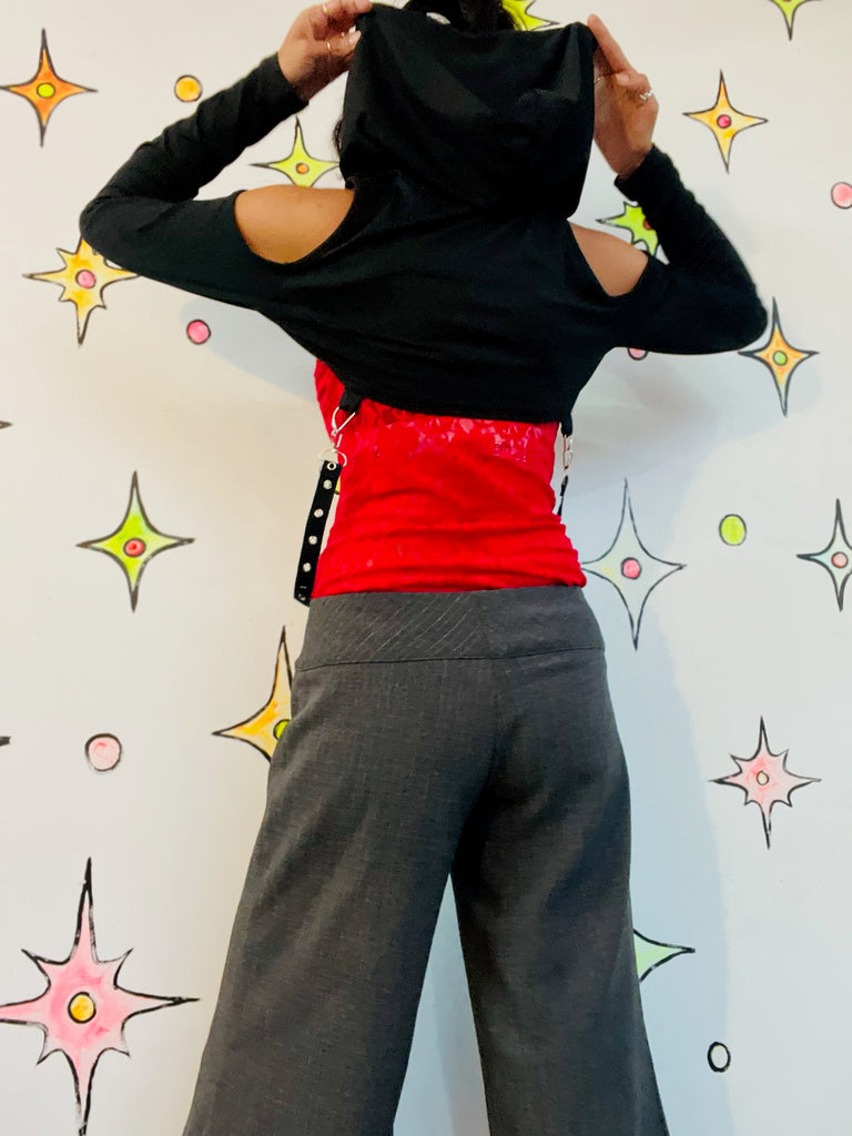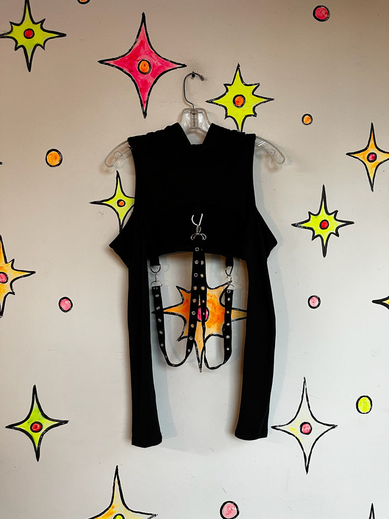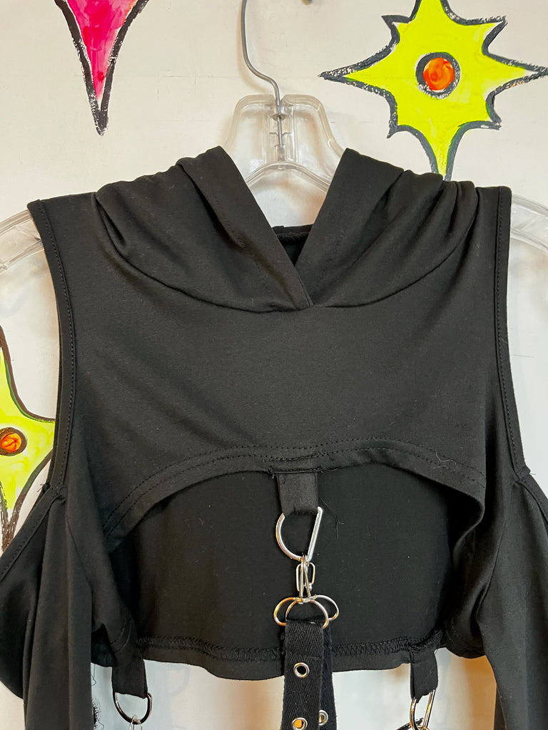 Y2K Black Goth Vixen Vamp Punk Metal Bondage Harness Crop Top Hoodie M