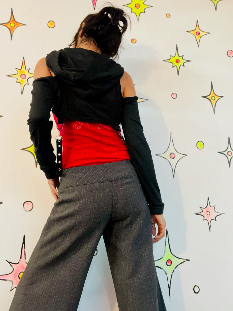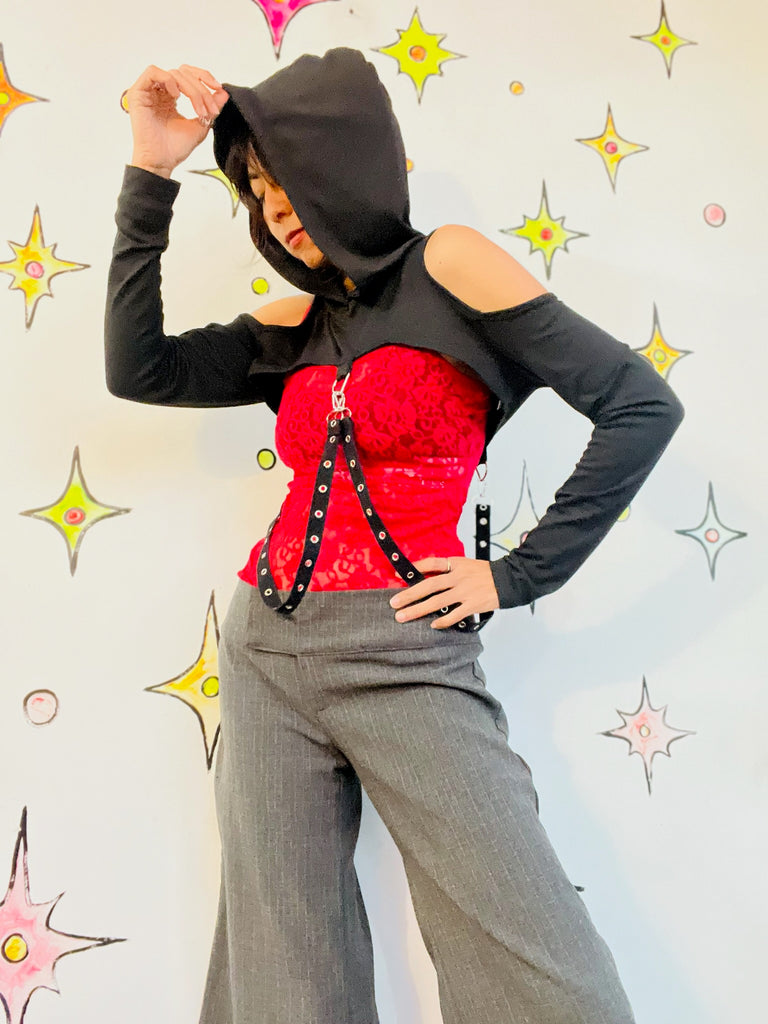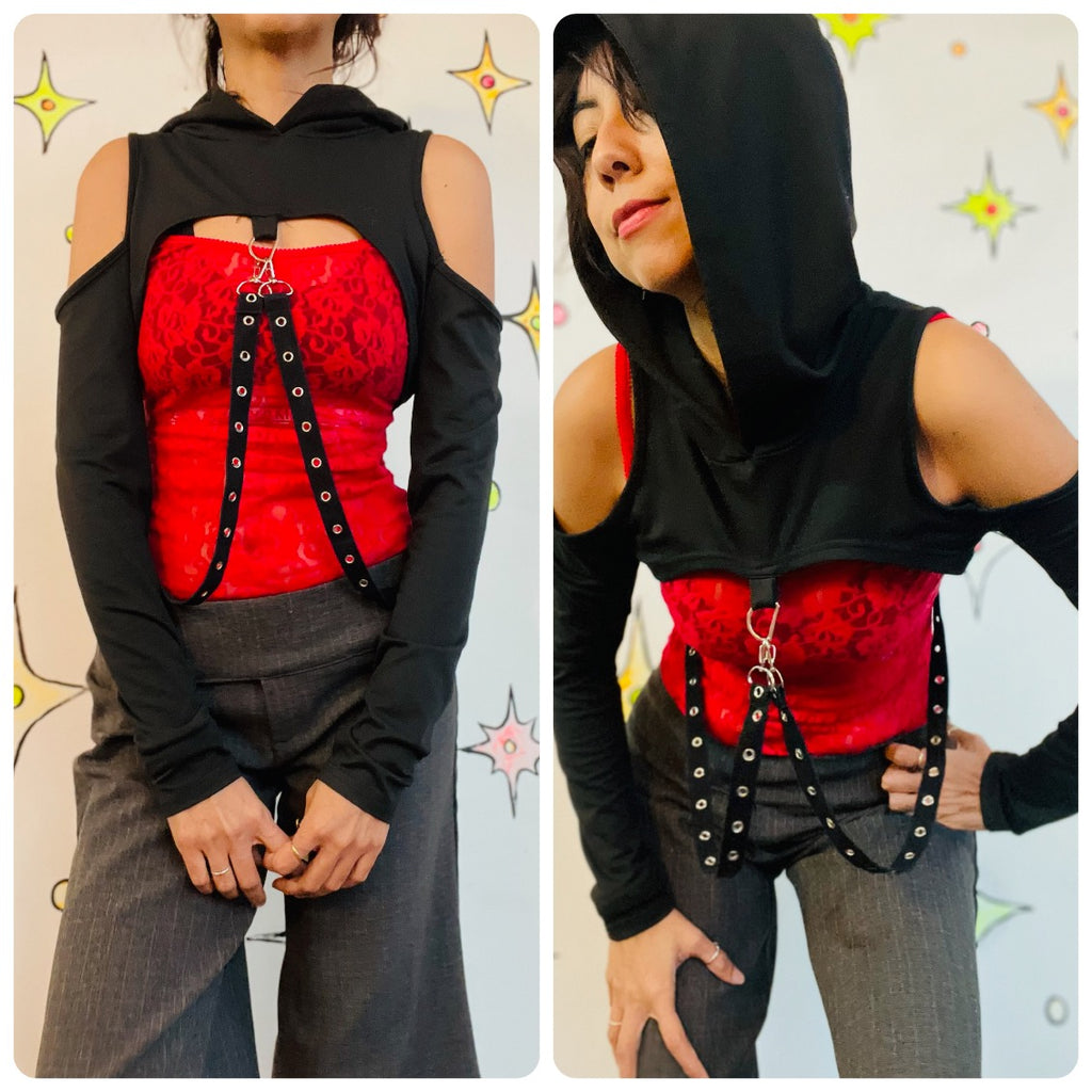 Y2K-era goth vixen style black hooded crop top with edgy punk and vamp vibes. Features a dramatic cropped cut with harness-inspired bondage detailing and a fitted, stretchy feel. Perfect for layering over tanks or bras for a bold alternative look. Made by Romwe and in very good condition with no visible stains, holes, or alterations. A statement piece for goth, punk, metal, or Y2K-inspired wardrobes.