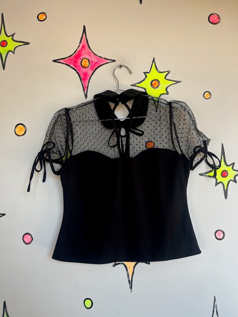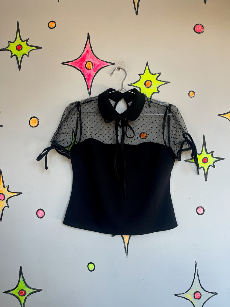 Y2K Black Lace Cropped Blouse β Babydoll Bow Neck Top β Goth Grunge Coquette β L