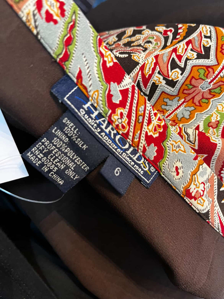 Measurements (laid flat): length 38", waist 13 ¾" (non-stretchy), hips 16". Size 6. Shell: 100% silk, lining: polyester. Brand: Harold's.