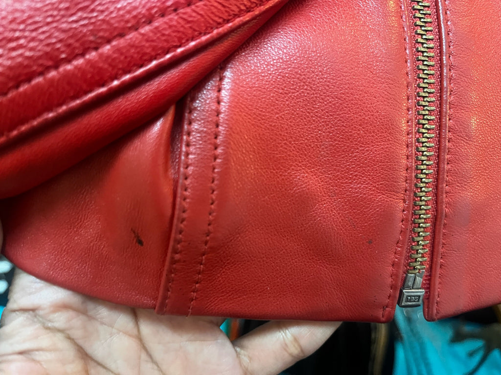 Bold Y2K-era cherry red leather moto jacket with indie sleaze and glam rock attitude. Crafted from 100% genuine leather, this cropped silhouette is perfect for layering over tees or dresses for an edgy, statement look. Features a classic moto-inspired cut with a sleek fit. In very good vintage condition with no tears or alterations; there are a few tiny marks near the lower front (see photos), consistent with gentle vintage wear. A standout piece for Y2K, rock, and alternative wardrobes.