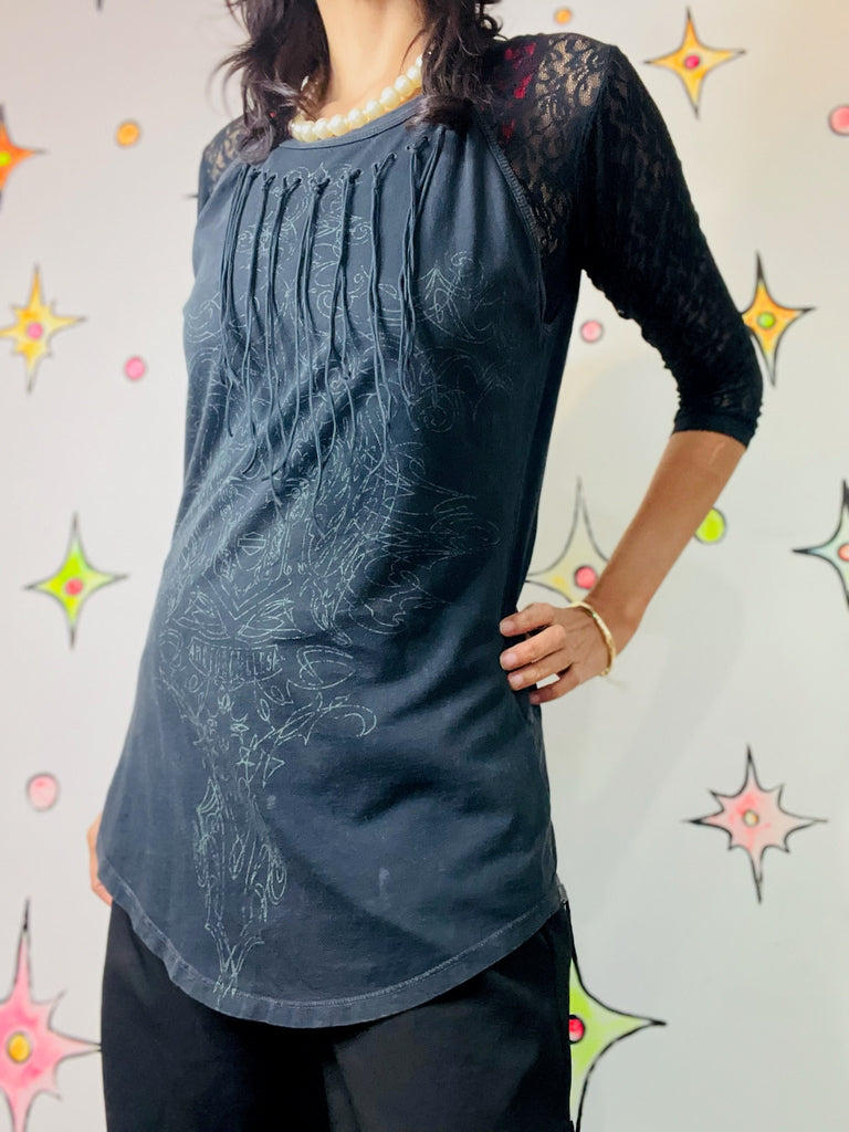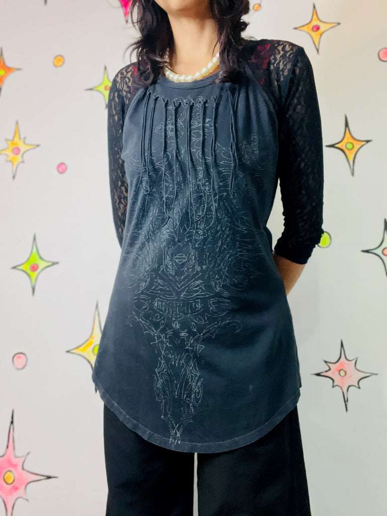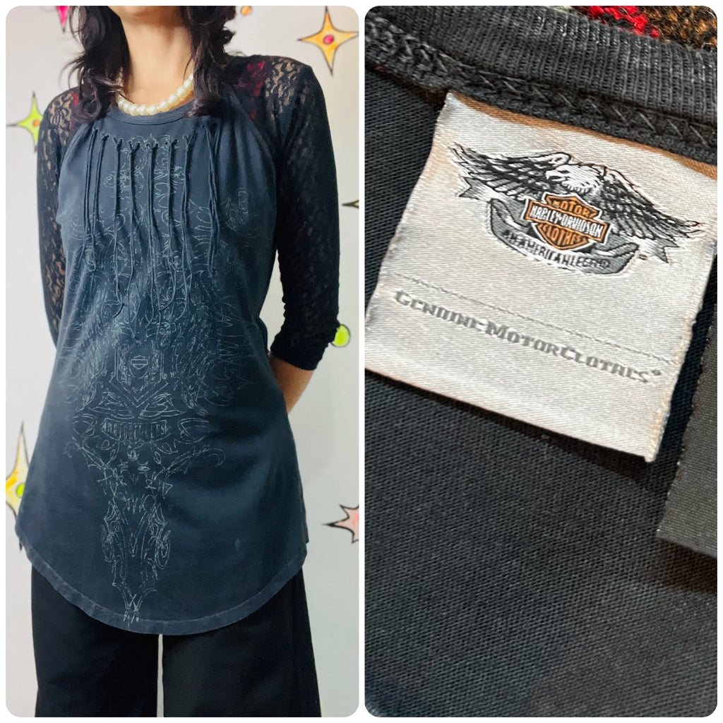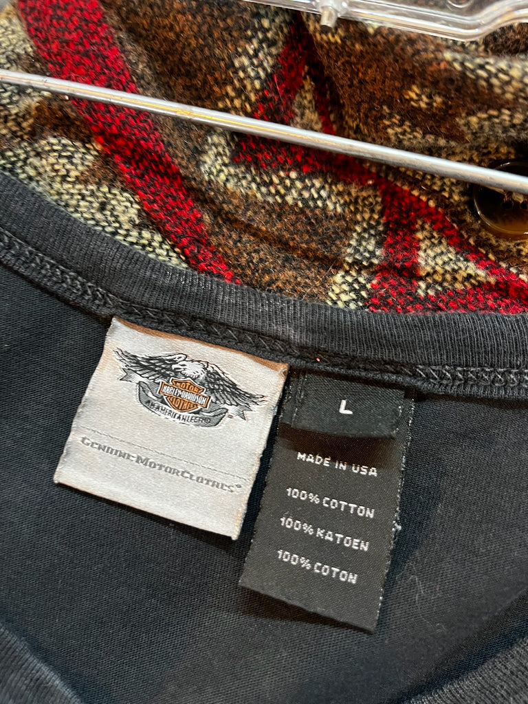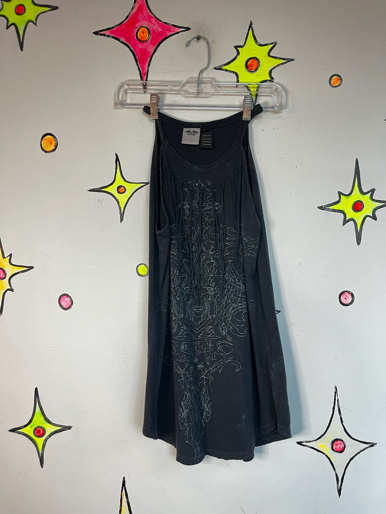 Killer Y2K Harley-Davidson fringe tank top with a distressed-style charcoal black wash and bold graphic. Western-biker-meets-grunge energy. Good vintage condition with no visible alterations or tears. Fabric has a washed/stained-look print - this is part of the style.