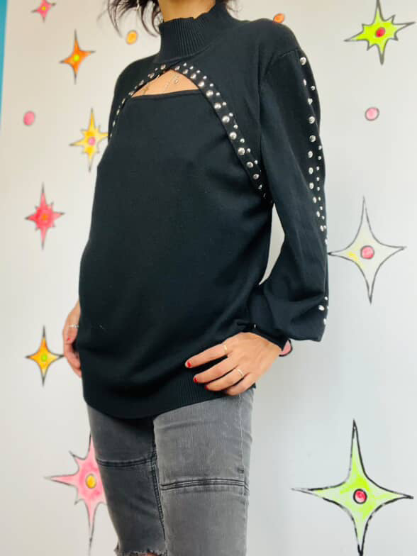 Vintage Y2K indie emo/goth style oversized black sweater with silver-tone stud detailing. Soft and stretchy fabric (no material tag). In VERY good vintage condition with no visible marks or tears. Cozy and edgy - perfect for layering or making a statement.