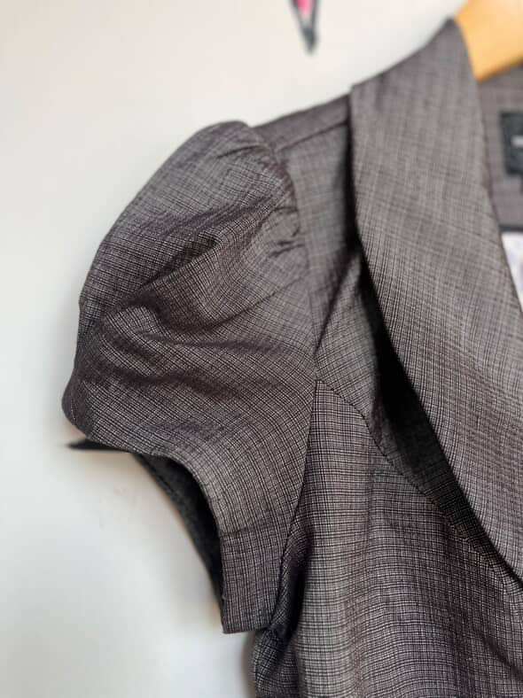 Stylish Y2K gray short sleeve blazer top by My Michelle in VERY good vintage condition. No visible marks or tears. Faux front pockets for a chic look. Slight threads pulled on the back (see pic).