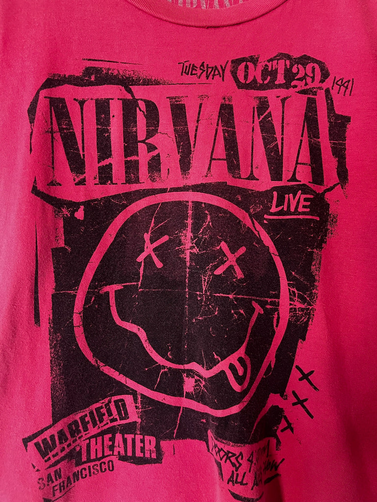Description: Soft Y2K Nirvana band tee with Wakefield Theater San Francisco print, perfectly broken-in for that authentic grunge vibe. Slight stretch in the worn-in cotton makes it extra comfortable for everyday wear or layering. Good vintage condition with intentional fade and cool vintage wear, no major flaws noted.
