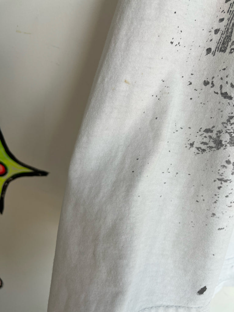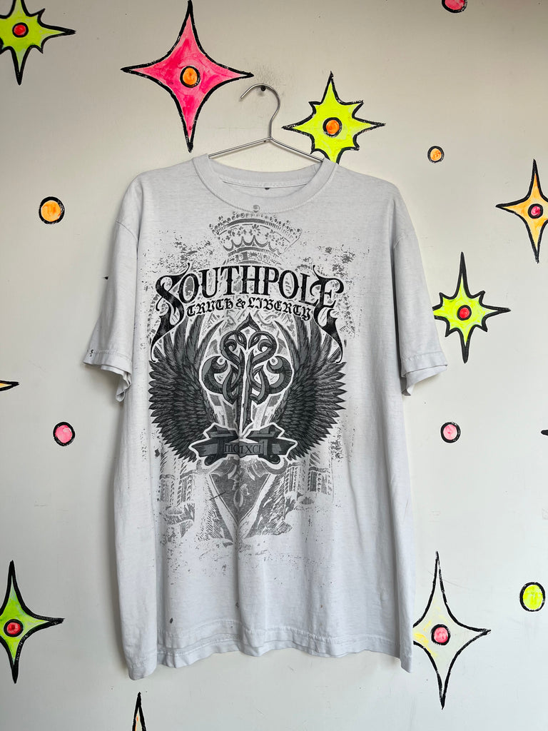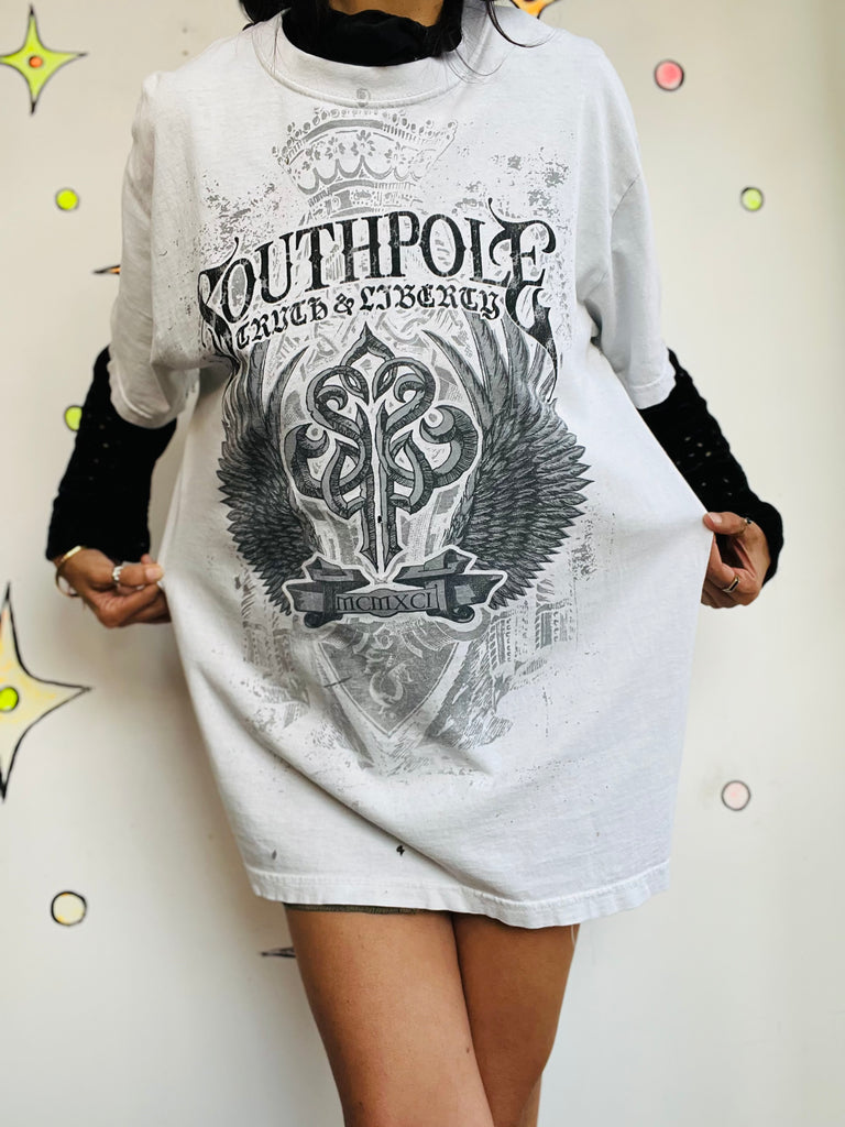 Description: Channel early-2000s Indie Sleaze and streetwear nostalgia with this vintage white Southpole tattoo print T-shirt. Crafted from 100% cotton, this bold graphic tee embodies the rebellious Y2K aesthetic - think skater culture, grunge clubs, and underground fashion scenes. Its soft, relaxed fit makes it perfect for casual wear or layering under a leather jacket or flannel for a true retro look.