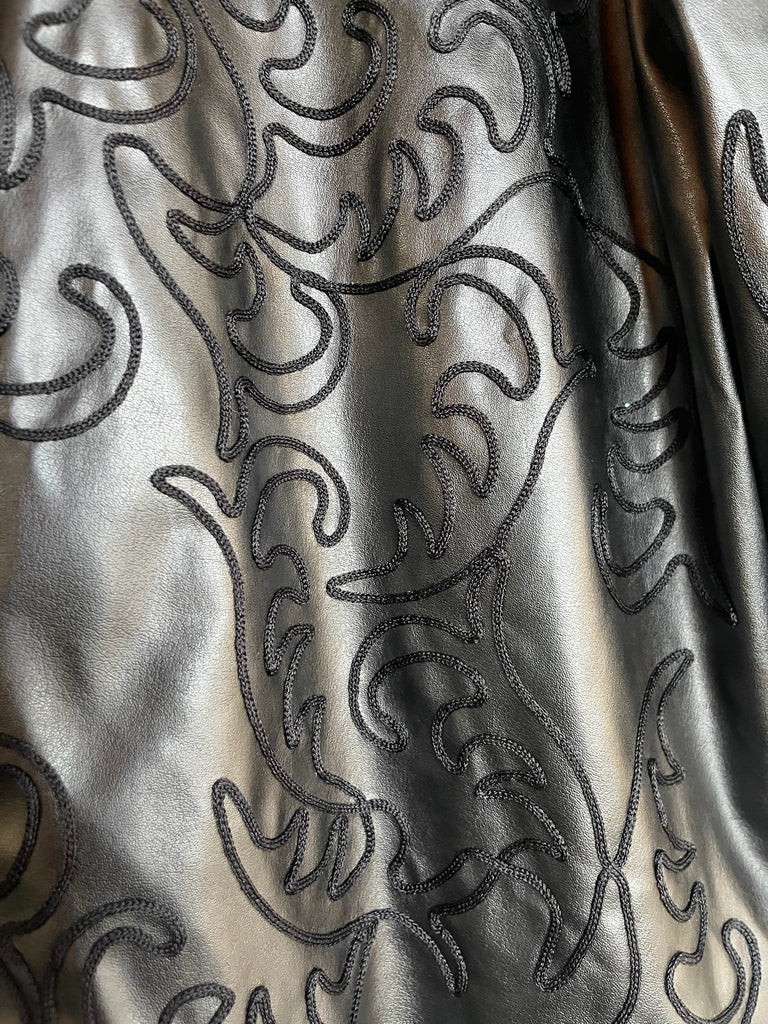 Y2K vegan black faux leather open-front jacket with western-inspired embellishments. Perfect for boho, fairy grunge, festival, or Y2K styling. Soft faux leather with detailed embellishments adds a whimsical, edgy touch to layered outfits or statement looks.